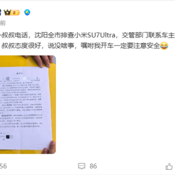 【“纽北之王”变马路杀手?沈阳排查小米SU7 Ultra只是一个开端】数码博主“测评君”表示,自己接到交警电话,沈阳全市排查小米SU7 Ultra。据其所述最好股票配资,当地交管部门正联系小米SU7 Ultra车主签驾驶安全承诺书,嘱咐自己开车一定要注意安全。