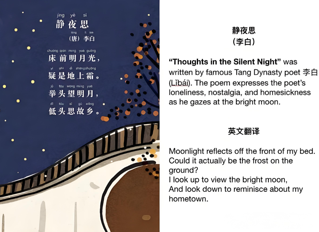 在YouTube和Tiktok上,不少外国小朋友用中文朗诵《静夜思》,甚至有外国老师将其改编成音乐剧。